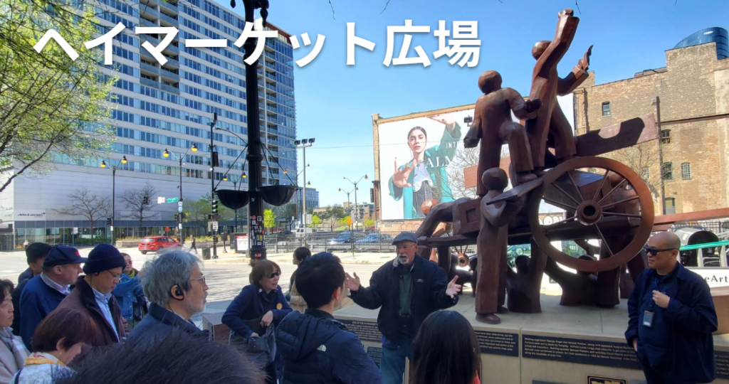 2024年、全群教委員長がアメリカで行われたレイバーノーツ大会(世界中の労働者が集まる大会)に参加したときに撮った写真です。1886年5月4日、抗議集会が開かれ、爆発事件が起こったヘイマーケット広場には、労働者を象徴するモニュメントが設置されています。