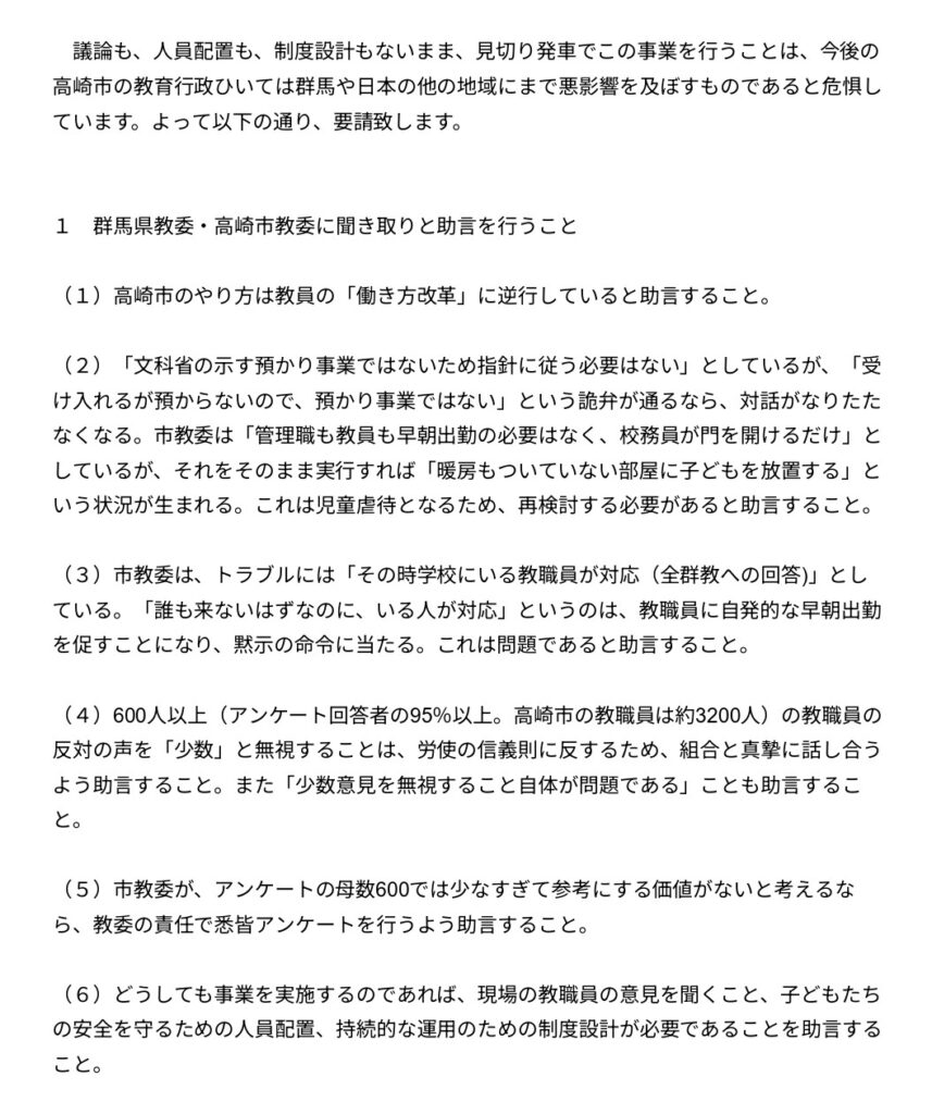 (4)600人以上(アンケート回答者の95%以上。高崎市の教職員は約3200人)の教職員の反対の声を「少数」と無視することは、労使の信義則に反するため、組合と真摯に話し合うよう助言すること。また「少数意見を無視すること自体が問題である」ことも助言すること。