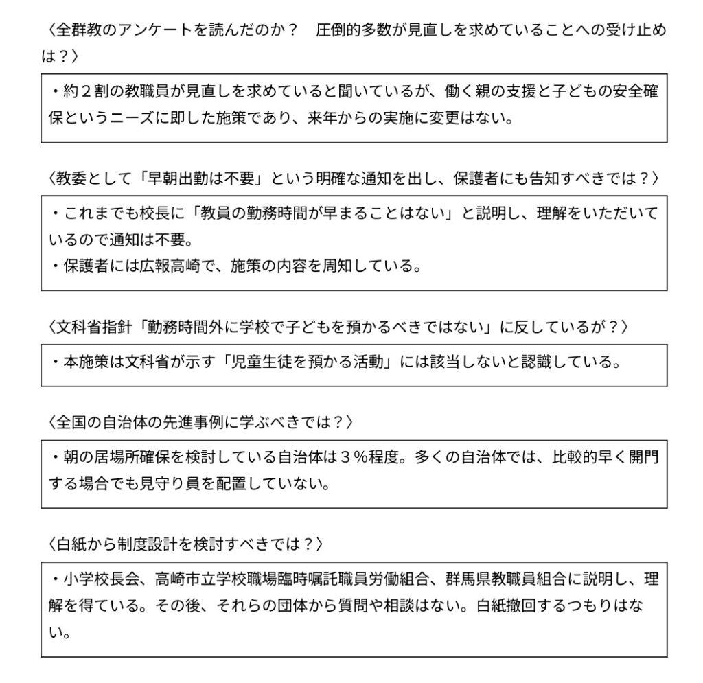 文科省も「開門事業であって預かり事業ではないから、見守りは不要」「事故があったら市が賠償するのだから、安全を守るための制度設計は不要」という高崎市教委の態度に、「まさか指針(※)をそういう風に捉えるとは…」は驚いていました。(極めて悪質な曲解ですからね)