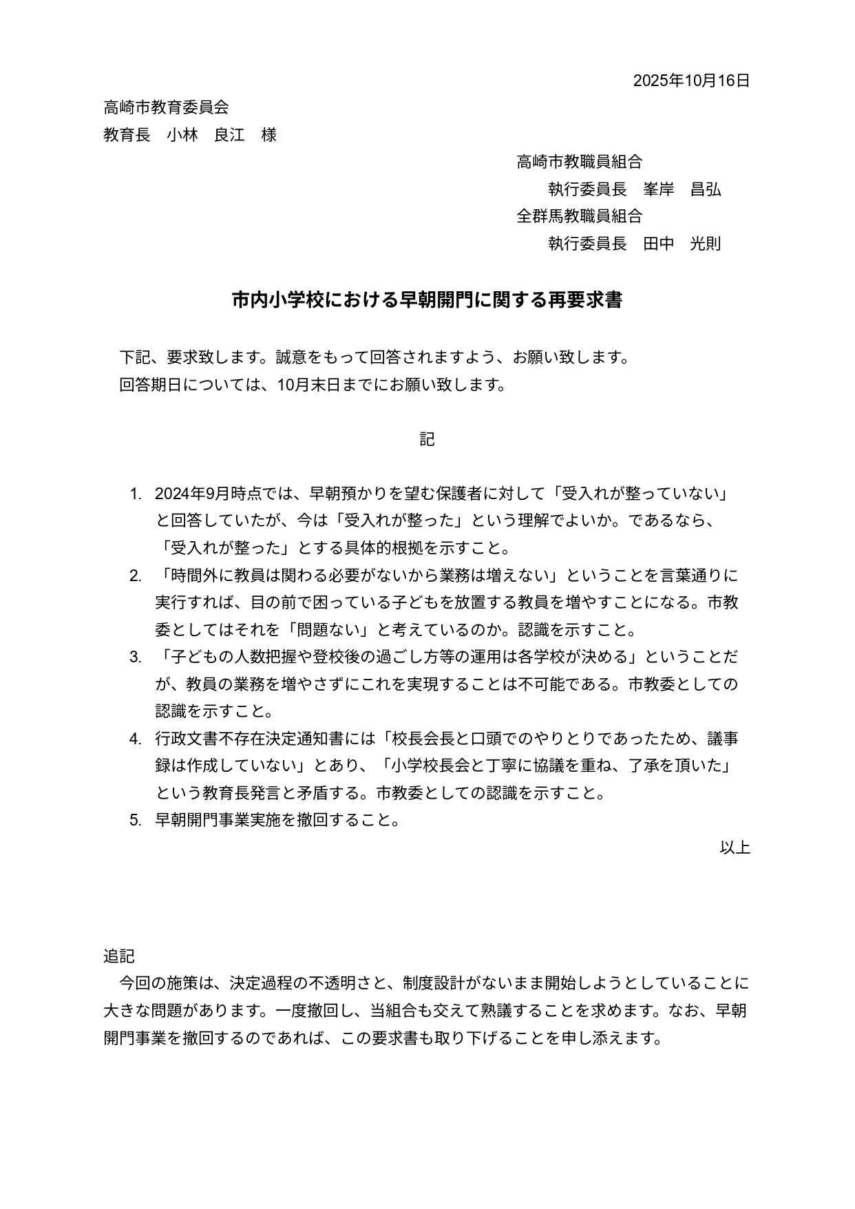 1回目は8月8日。2ヶ月以上待たされ、交渉が設定されたのが10月16日。完全なゼロ回答であったため、即日2回目の要求書を提出。これについて市教委は対面での交渉を設定せず、11月18日にA4一枚の回答を送ってきました。もちろんゼロ回答です。