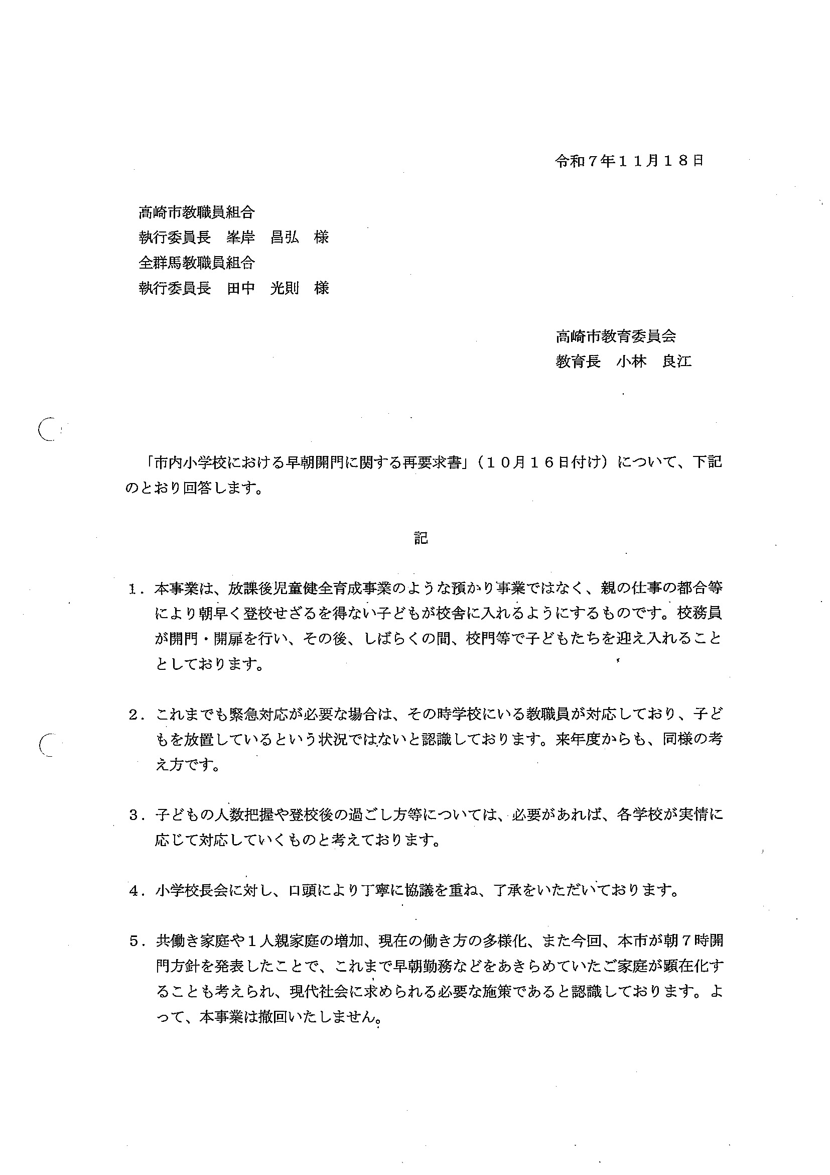 市教委による回答(2025/11/18)