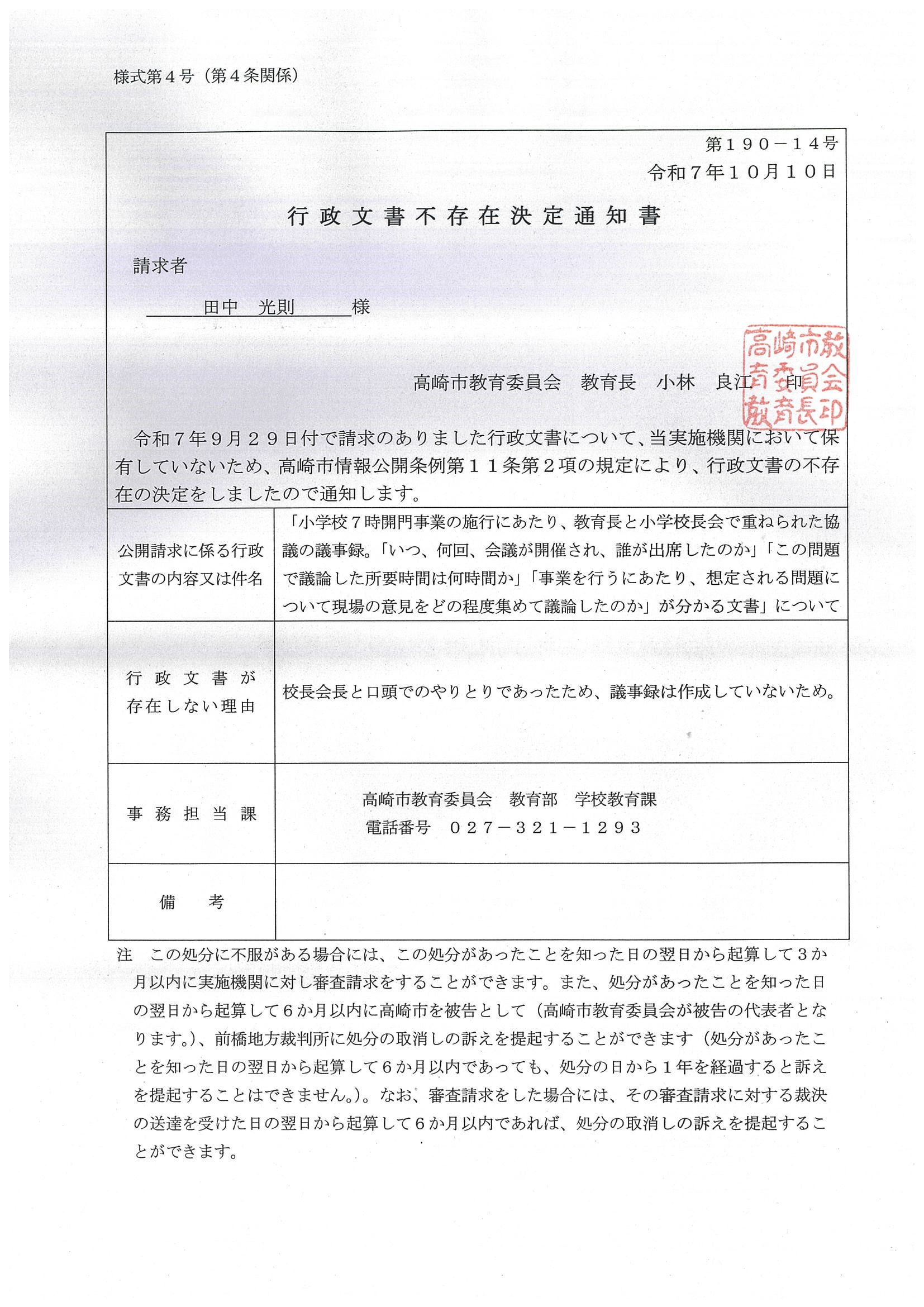 高崎市では行政決定をすべて口頭で行うようです。そもそもこの7時開門事業自体が一部の人たちの口頭で決まり、決定までのプロセスが議事録に残されていません。